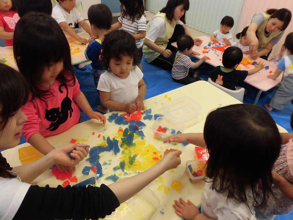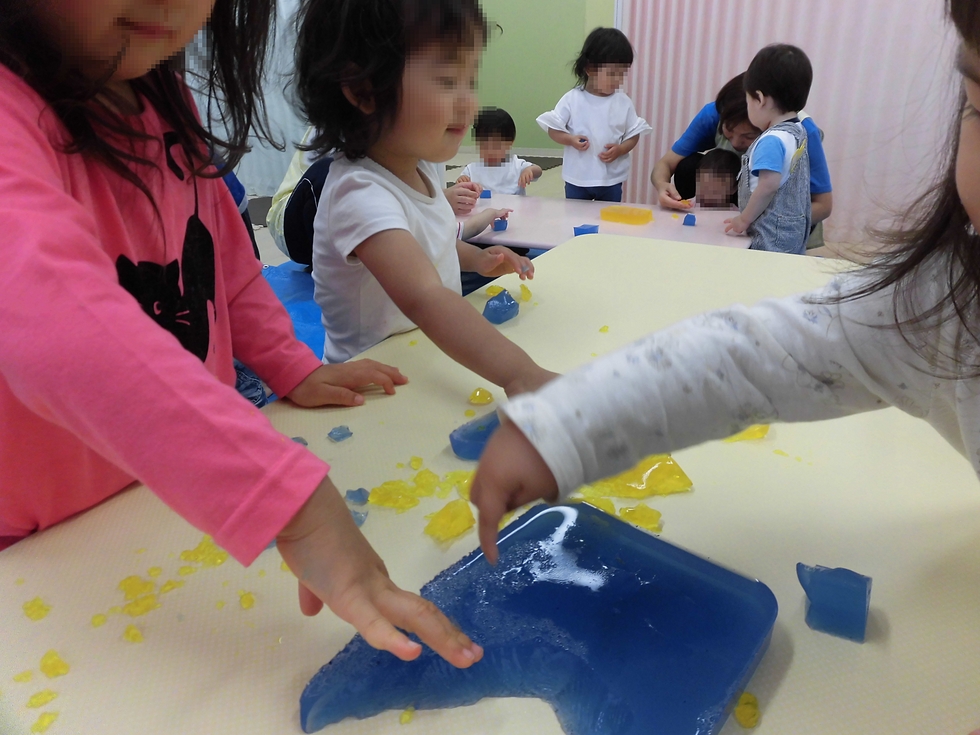 「冷たーい〜」「ぬるぬるしてるぅ〜」「○×※△□〜♪」はじめは恐る恐る触っていた子天使ちゃん達、慣れてくると潰したりこねたり(笑)。たっぷりと寒天遊びを楽しんだみたい(^o^)。