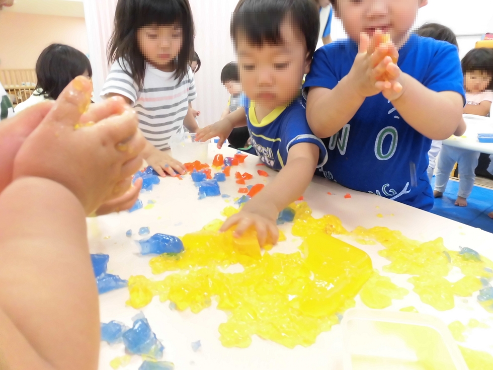 冷蔵庫から出してきた色とりどりの寒天〜♪触って、つぶして、混ぜて、触感を楽しみます(^-^)
