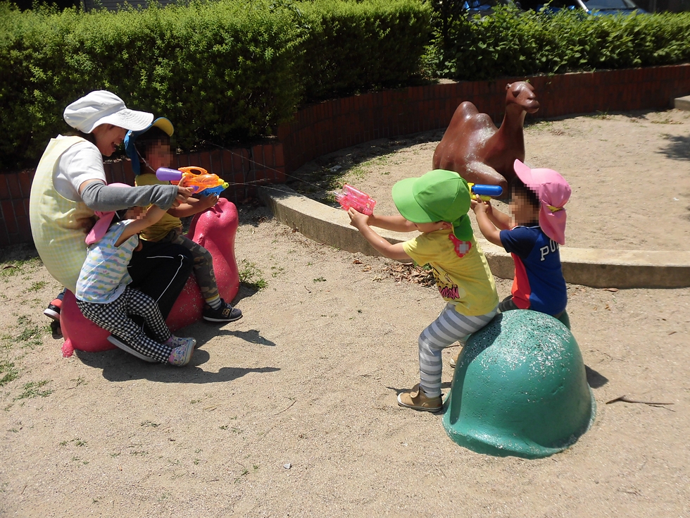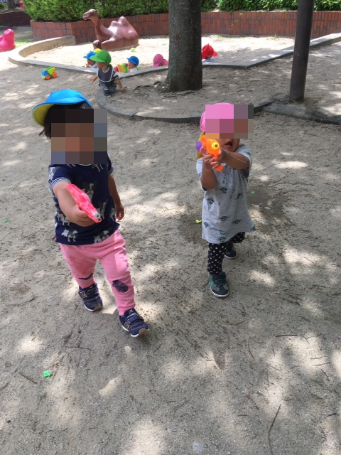 赤組(2才児)には例年7月から取り入れる「水鉄砲&水爆弾遊び」を今週から始めちゃいました(^-^)。