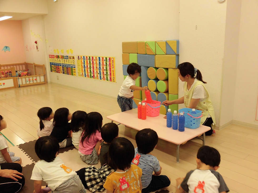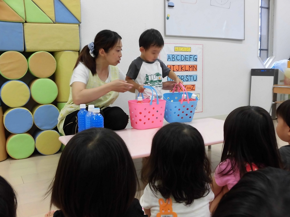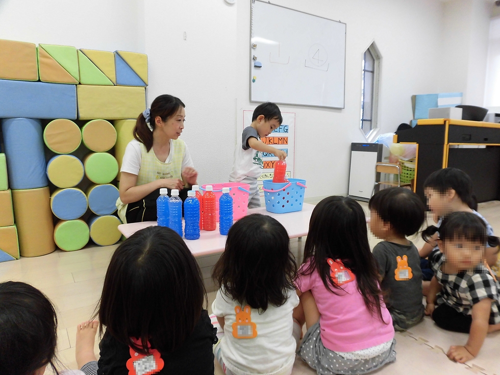 今週は数字の概念「重さ比べ」をしました。ペットボトルの本数に応じて重さが違います(^-^)。