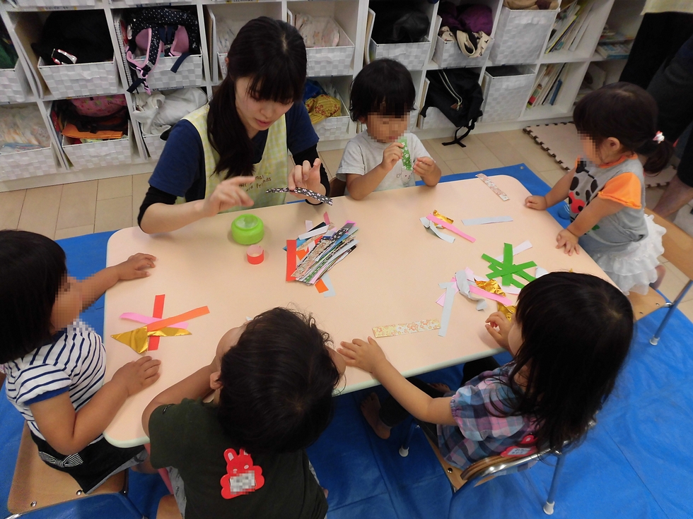 先生から織姫と彦星のお話を聞いて、七夕制作の開始です。スイカやお星さま、リング輪などなど、黄組さん(0才児)はシール貼りとスイカの種描き、オレンジ組さん(1才児)は糊づけと輪っか作り、赤組さん(2才児)は先生と一緒にハサミでチョッキンチョッキン、子天使ちゃん達、真剣です(^-^)。