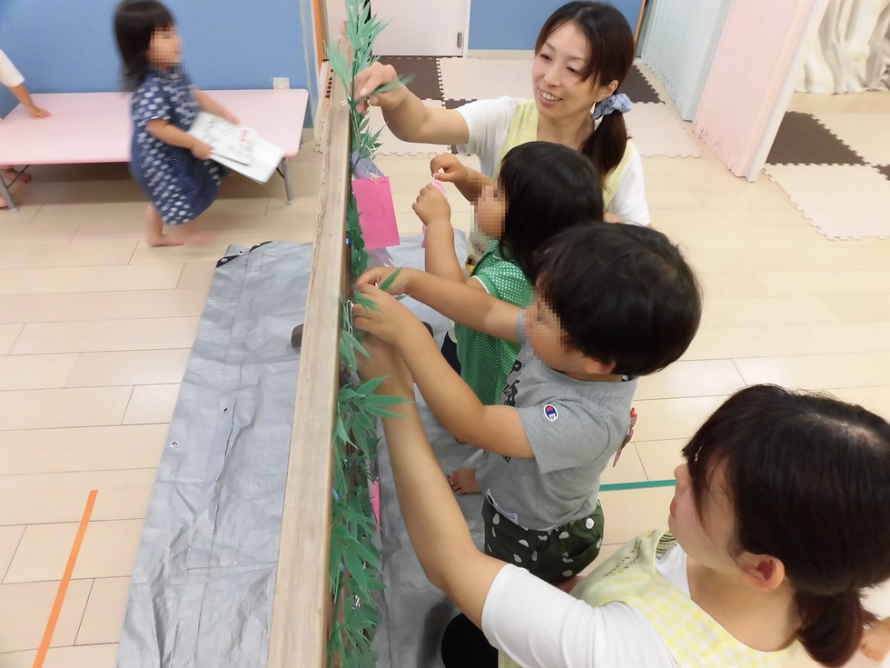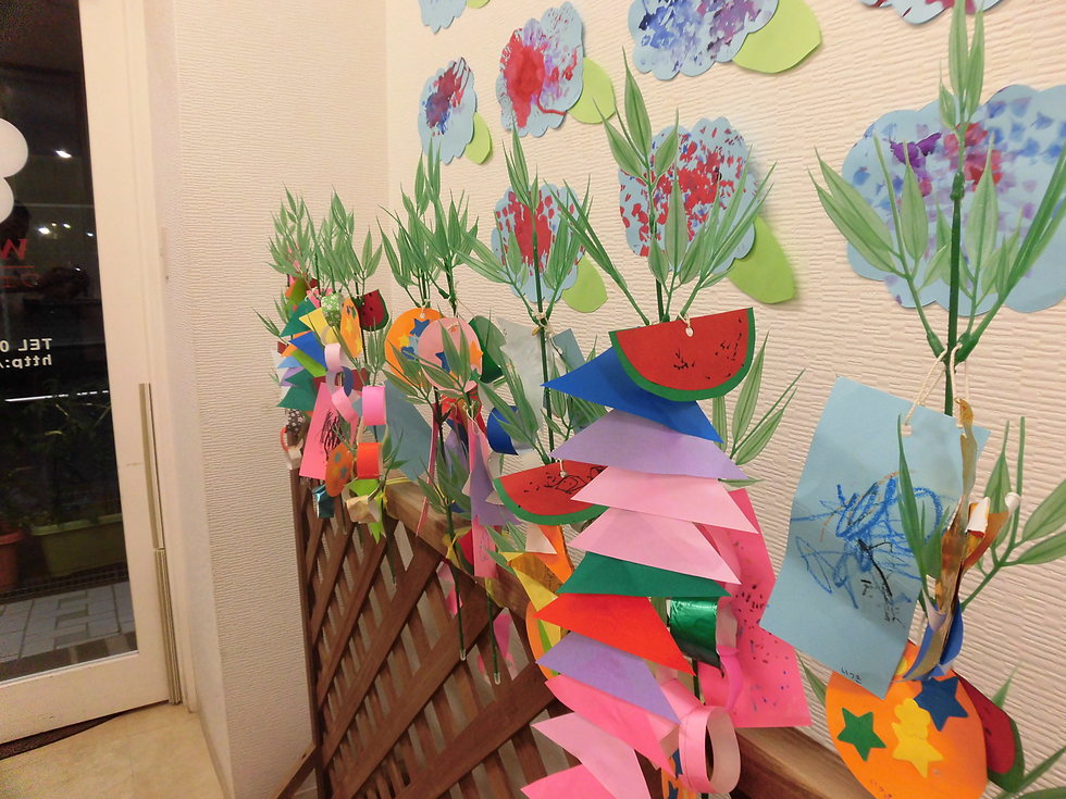 みんなで飾りつけ、素敵な笹飾りが出来ました(^o^)。短冊には「どんなお願いをしたの〜?」、かなえばいいね!