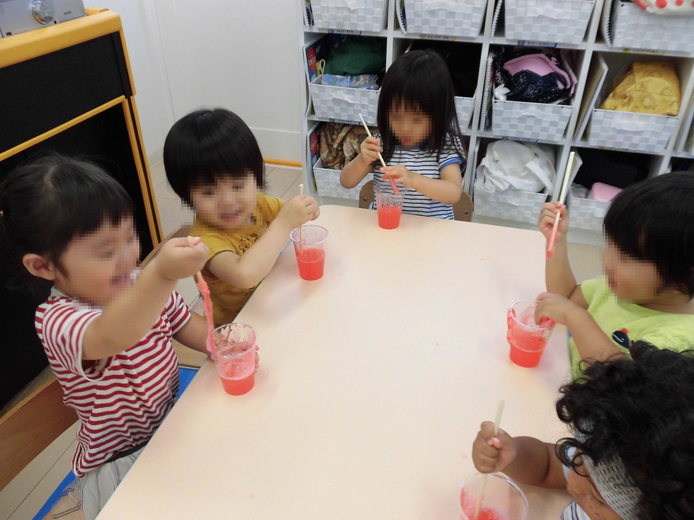 スライム作りが始まりました。コップに色水を入れて〜洗濯糊を入れて〜ホウ砂を入れて〜『まぜままぜまぜ♪』『まぜまぜまぜまぜまぜ♪』
