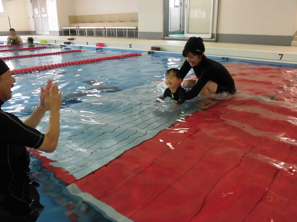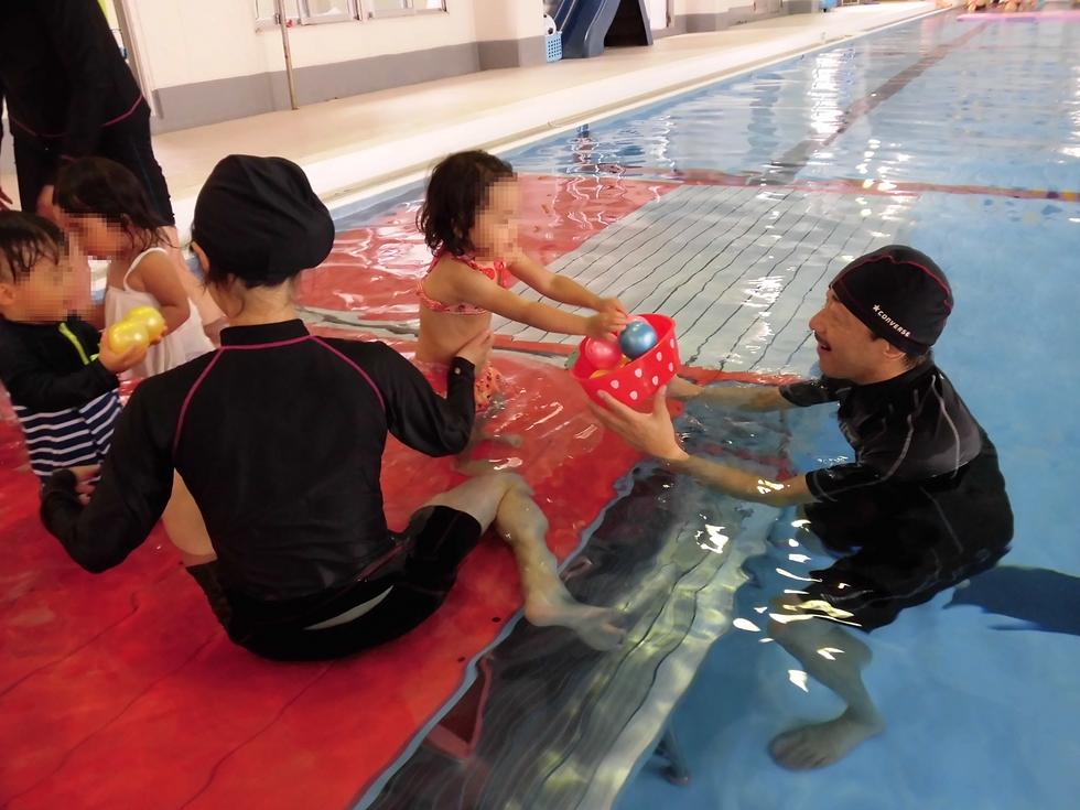 水中ボール拾い、先生と一緒にワニさん歩き、腕浮き輪を付けてお水に浮くことにも挑戦しました。最後は自由にチャポチャポ遊び(この頃になると全員ちゃんと参加していましたよ)。
