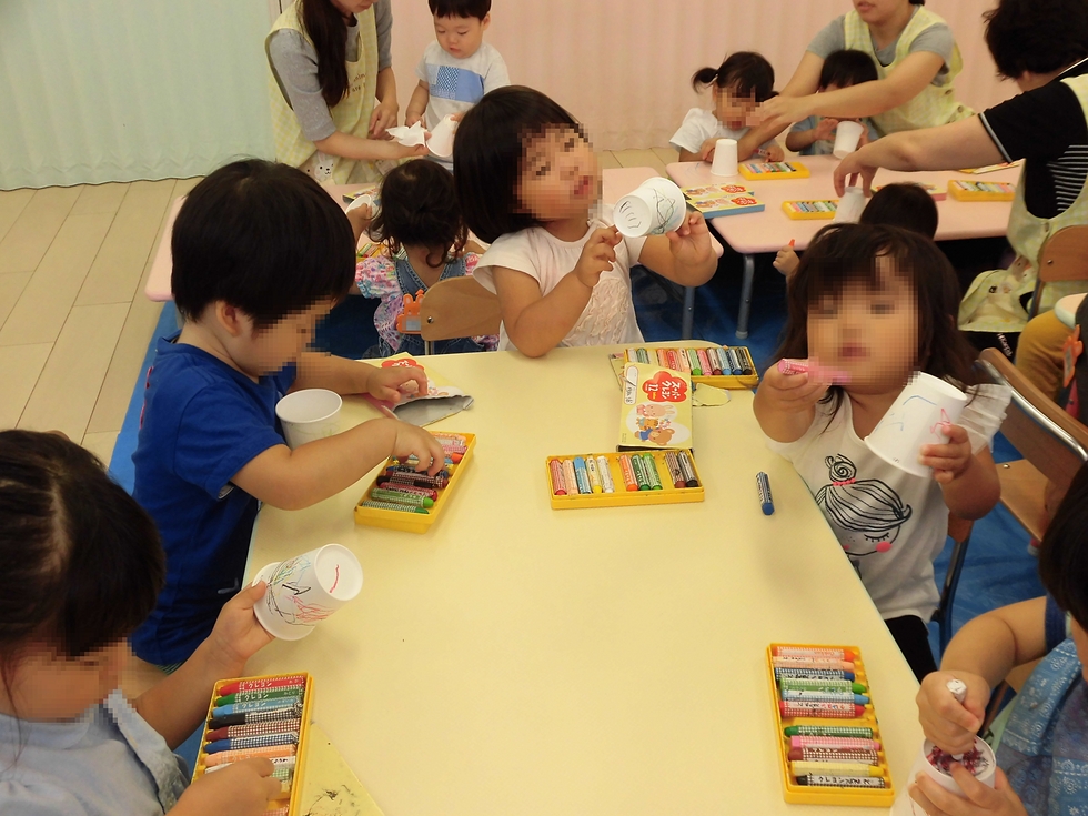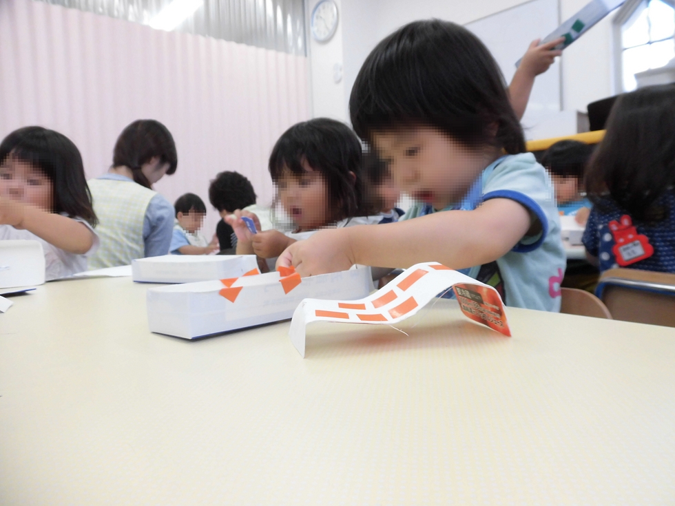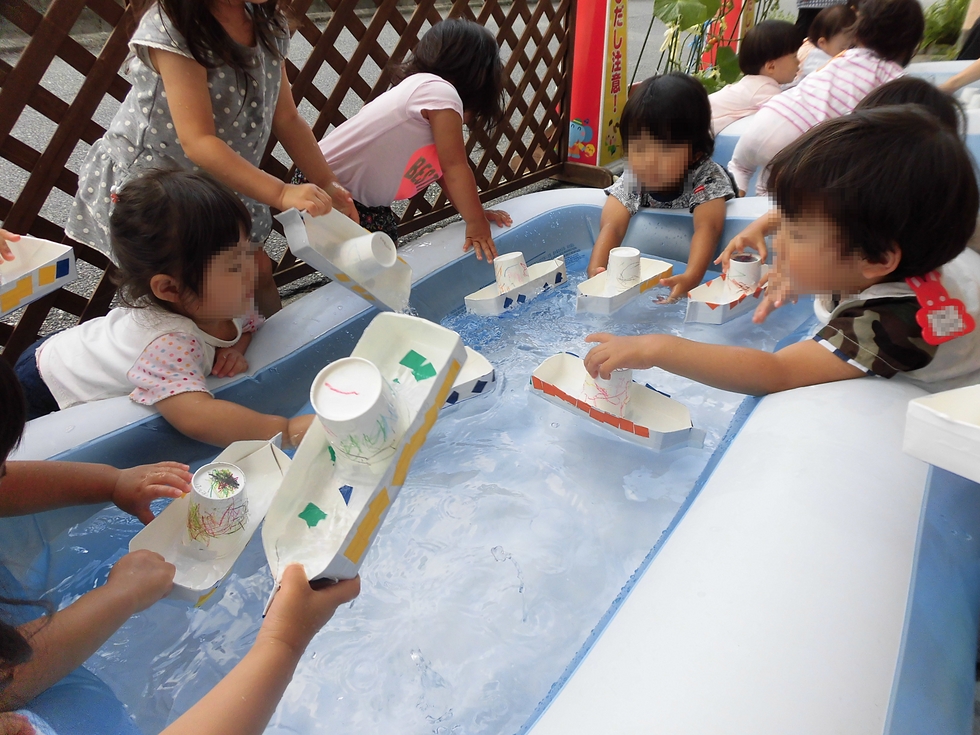 午後の設定保育では自分で作ったお舟をプールに浮かべ遊びます(^-^)。自分で作った玩具で遊ぶのが大好きな子天使ちゃん達です(^o^)。