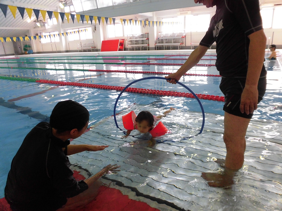 左下の写真は一人で水の中、輪っかくぐりをしている1才児子天使ちゃん(^-^)
