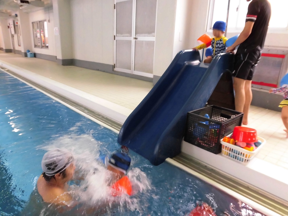 右下写真はスライダーから勢いよく水に潜り込む2才児子天使ちゃん(^-^)。