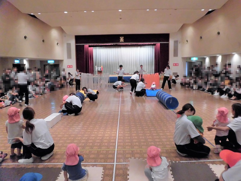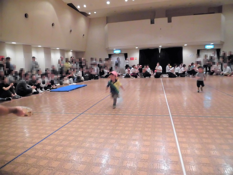 障害物リレーの後は親子競技、お父さんお母さんはコアラやペンギン・カンガルーになって我が子を運びます。お父さん張り切りすぎてお子さんを置いていかないで下さいね〜(笑)