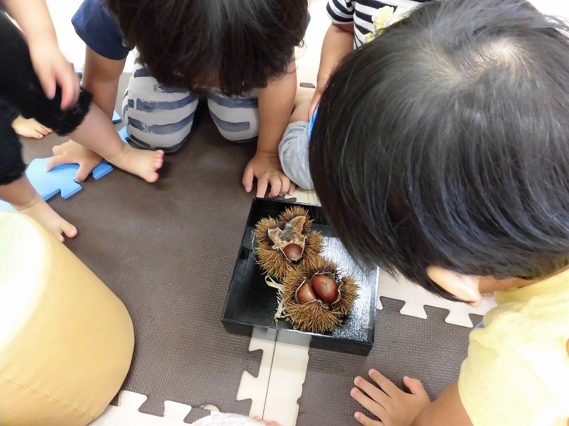 夏が終わり、めっきり涼しくなって過ごしやすくなりました(^-^)。秋は秋で子天使ちゃん達が経験しておきたいこと、知ってみたいことが沢山(^o^)。写真はIA先生のご実家の山でとれた栗!子天使ちゃん達、興味津々〜♪「触ると刺さっちゃうよぉ(>o<)〜」(笑)