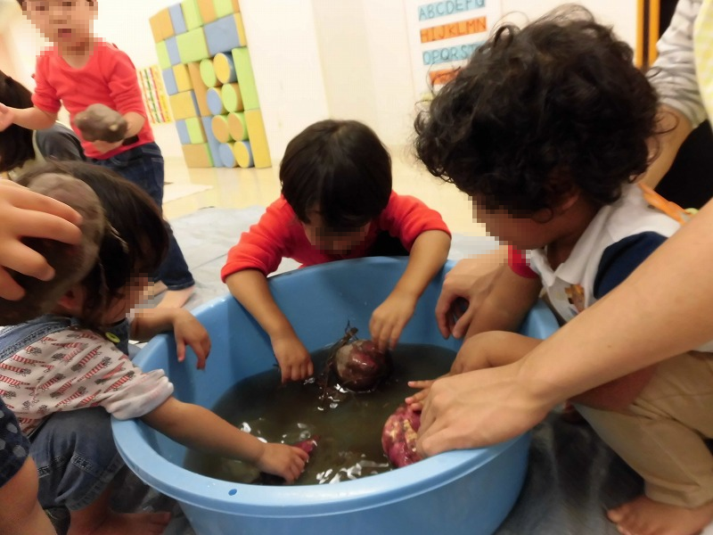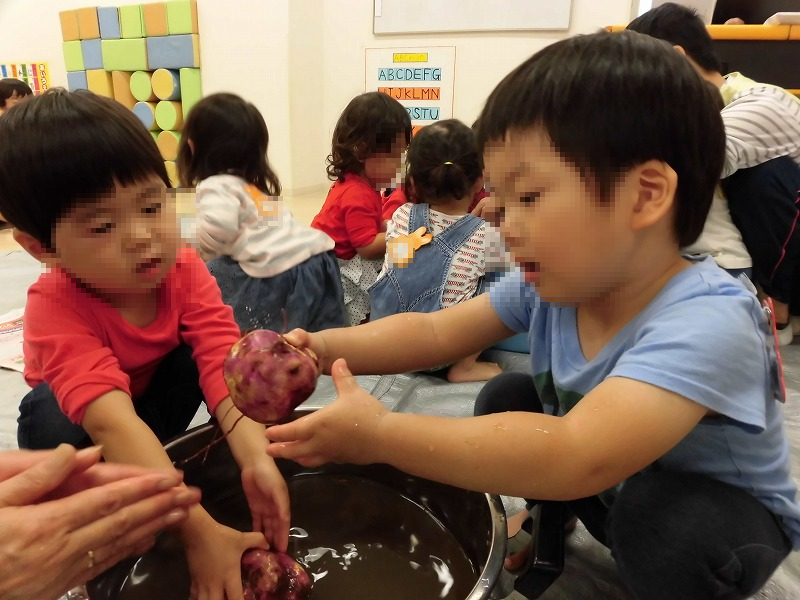 今日は園に少し残していたお芋で「お芋洗い体験」をしました。『ジャブジャブ、シャカシャカ♪」お芋についてる泥をキレイに落とします。
