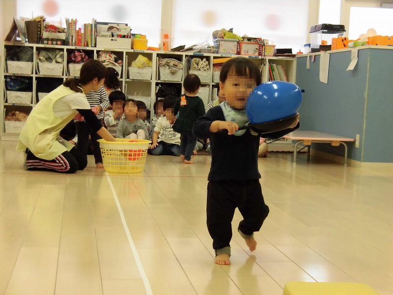 写真はフライパンで上手に風船を運ぶ 0才児子天使ちゃん。0才児でもこんなに上手にできるんですよ(^-^)。