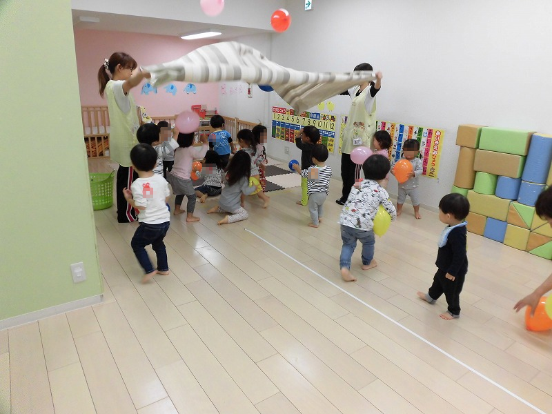 子天使ちゃん達は風船遊びが好きなんですよね〜(^-^)大きな布をパタパタすると風船はフワフワ、子天使ちゃん達は大喜び!