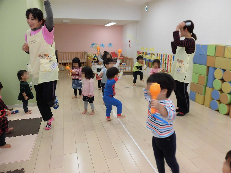 写真は音楽リズムプログラム、ハンドベル鈴・タンバリン・マラカスから好きな楽器を選んで、先生のピアノに合わせて楽器をならし身体を動かします。