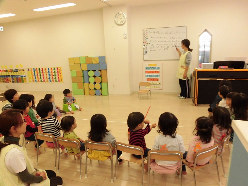 左下の写真は文字遊びプログラムの一コマ、しりとりをしています。優しく楽しく導いてやれば2才児さんなら簡単にしりとりが出来ちゃうんですよ(^-^)。