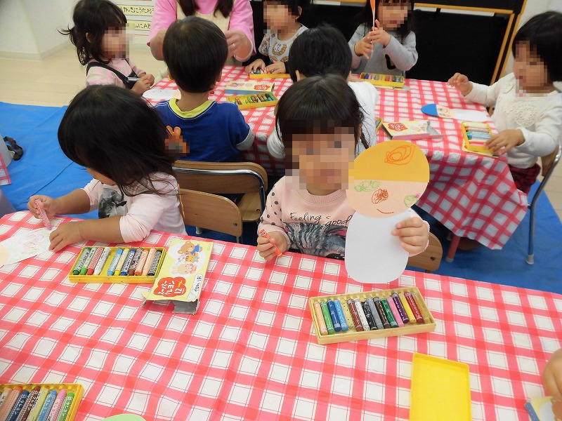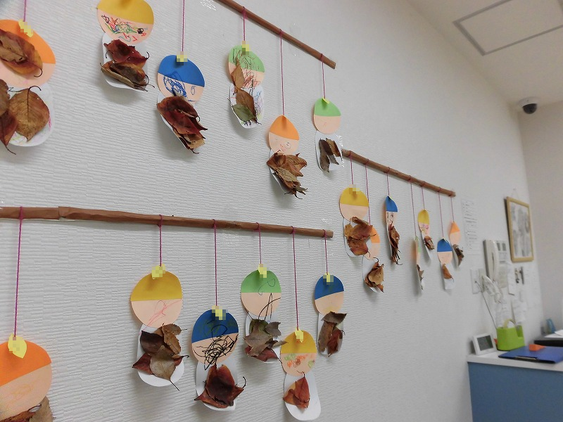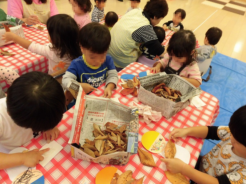 前日に公園で拾い集めた落葉を使って。落葉を糊で貼り付けるのは難しんですが子天使ちゃん達、自分達で集めた落葉は大切に扱います(^-^)1枚1枚ていねいに。