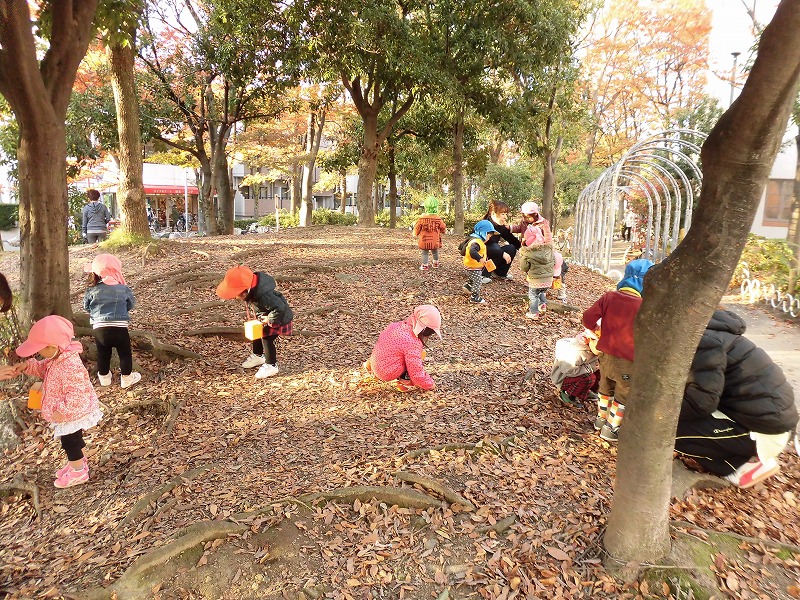 「どんぐりぃ、あった!」「みぃつけた!」「先生!みてみてぇ」あちこちから子天使ちゃん達の可愛い声が聞こえます(^o^)。