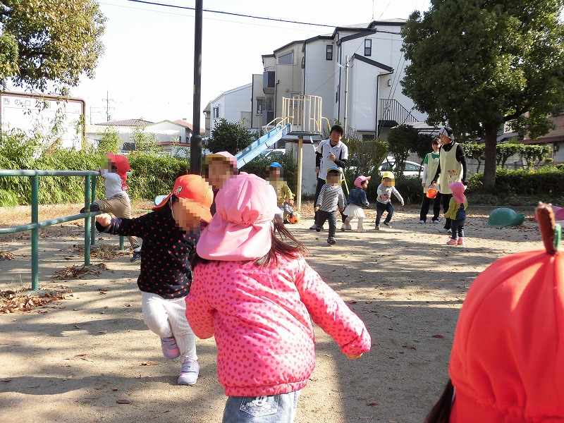 写真はオオカミごっこ(鬼ごっこ)。「イヒヒ〜、食べちゃうぞぉ〜」オオカミはもちろん園長から始まります(なぜ、もちろん?)(笑)。