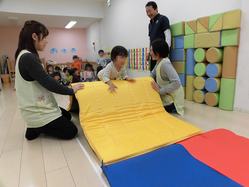 写真は壁のぼり&壁下りです(^-^)。これは全身の運動能力+平衡感覚+〈出来ると思う気持〉が必要なんです。子天使ちゃん達、笑顔で「キャッキャッ」と言いながら挑戦していきます(笑)。