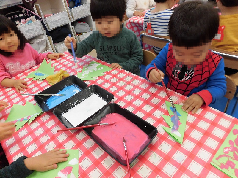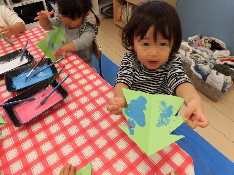 最初に先生の作り方説明をよく聞いて〜(^-^)画用紙を真ん中から折って〜♪広げて〜♪片方に絵具をヌリヌリ♪また折って、広げて〜♪