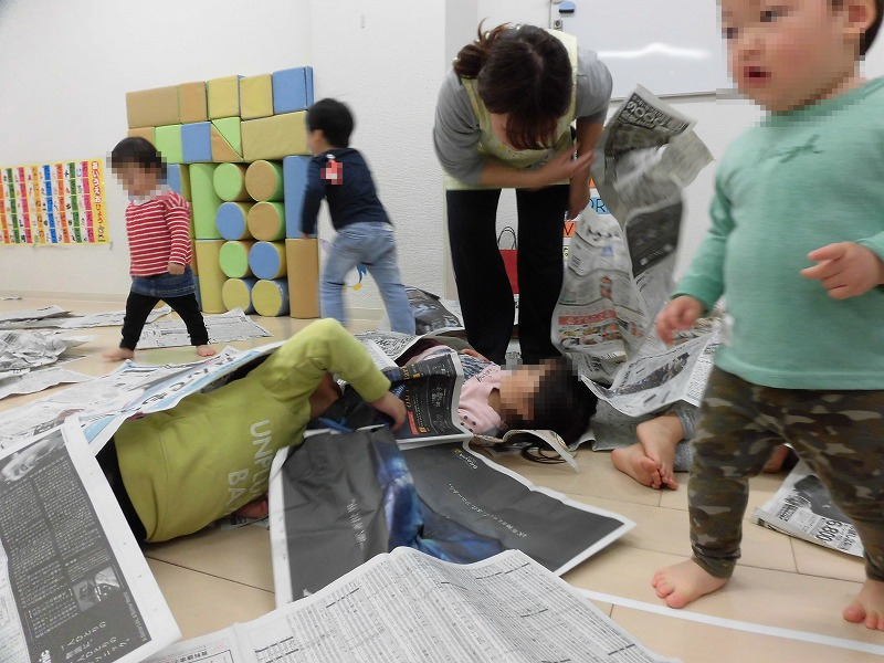 左下写真は新聞紙遊び。新聞紙に隠れる子天使ちゃん達(^-^)。