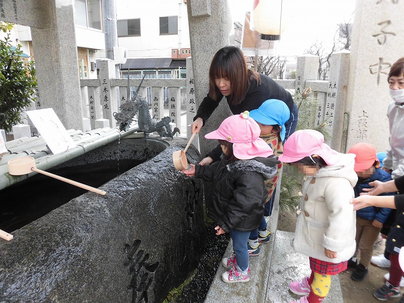 新年恒例の塚口神社に初詣(^-^)。手水舎で手に柄杓で水をかけ身を清めたら参拝です。鈴を鳴らして、2礼2拍手1礼です。神様へのご挨拶、上手に出来ましたか(^-^)。