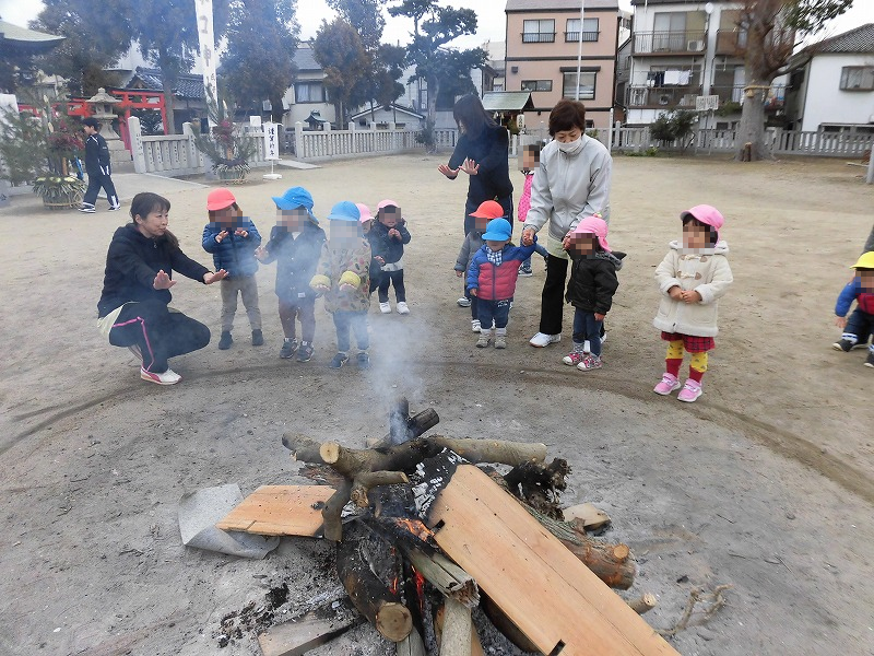 境内にはたき火が、最近ではたき火を見る機会も少なくなりました。子天使ちゃん達、初めはこわごわとたき火に近寄ります(笑)。暖かったねぇ〜(^-^)。