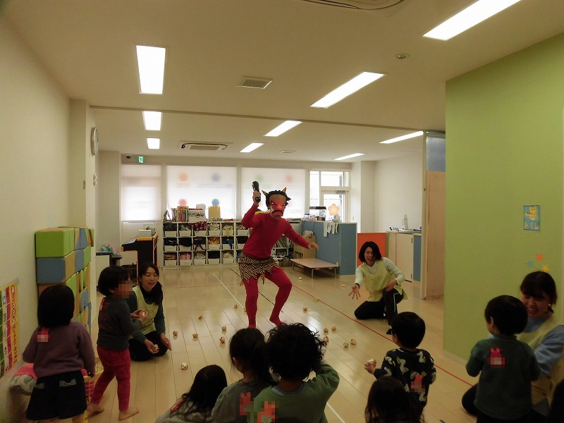 子天使ちゃん達は保育室の奥まで非難すると用意していた手作り豆(先週の工作の時間に子天使ちゃん自分達で作ったんですよ)を手にとって反撃開始です(^-^)。