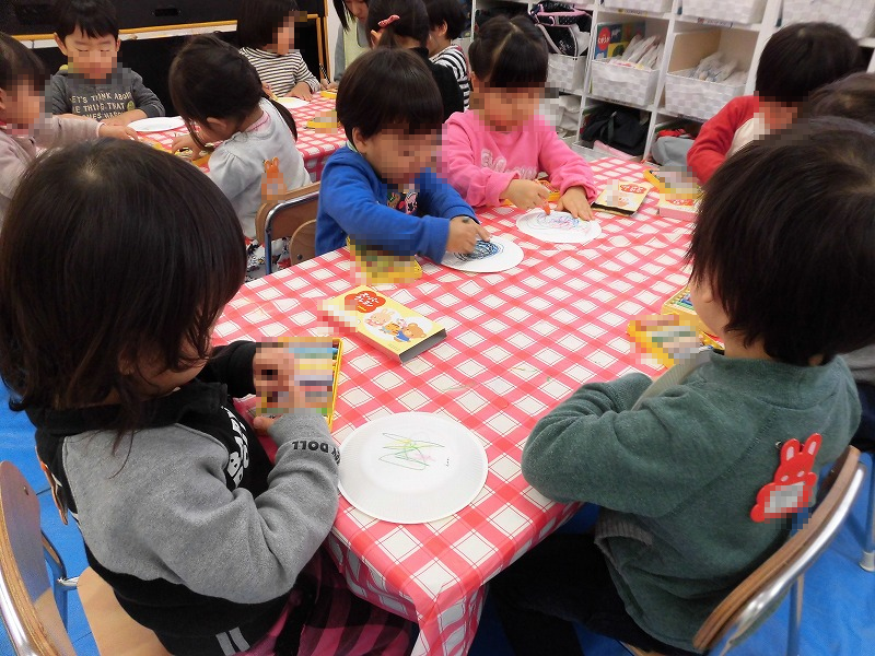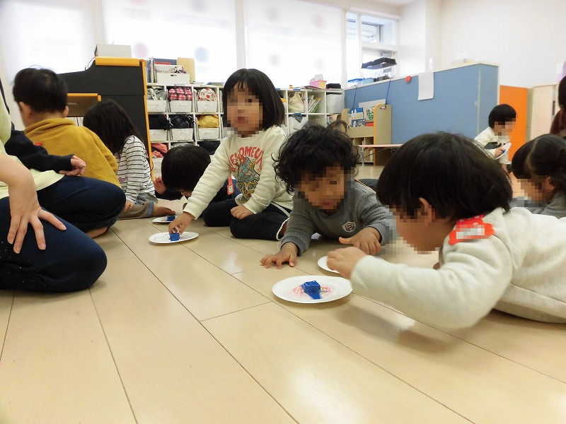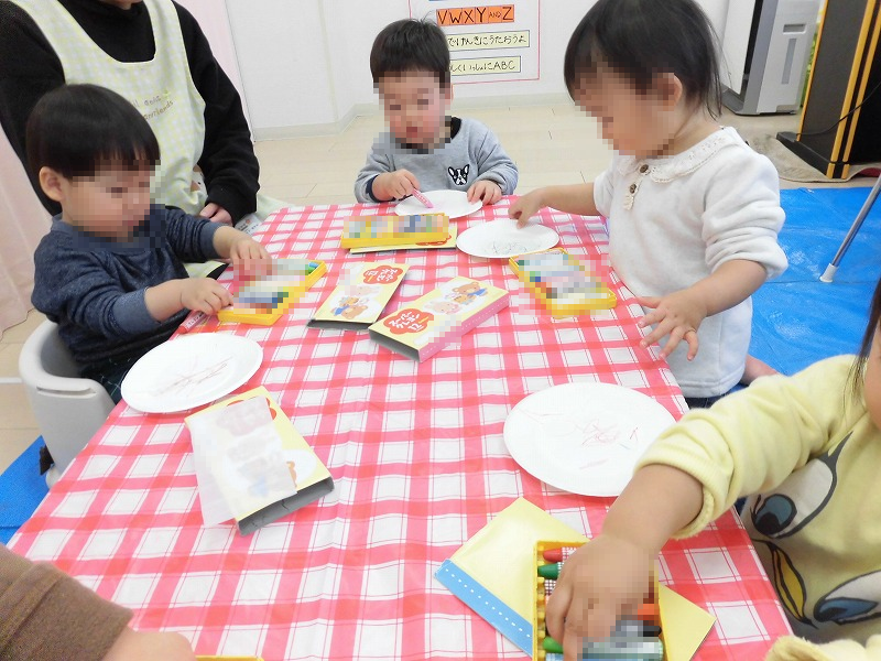 この時期になると0才児(満1才中期以降)さんも真剣に取り組めます(右下写真)。