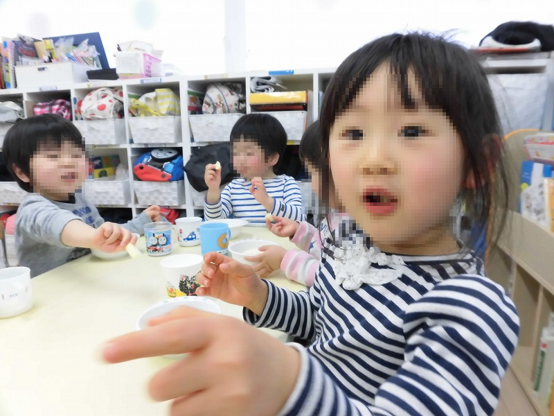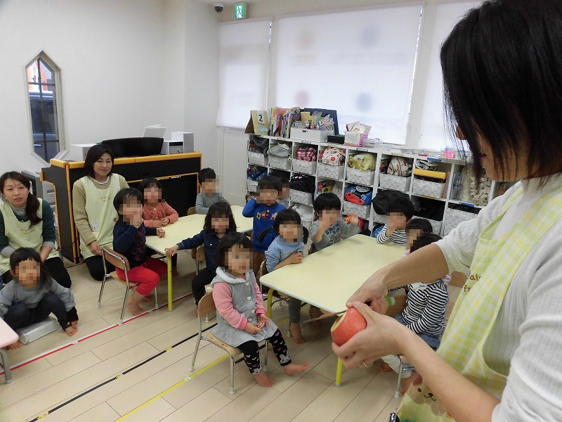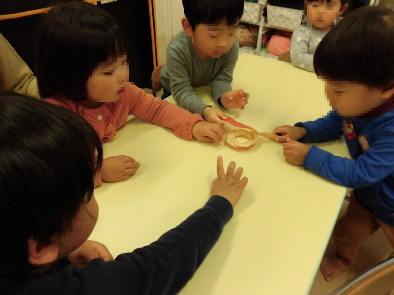 この日のおやつはもちろんりんご。シャクシャク甘くて美味しいね〜♪