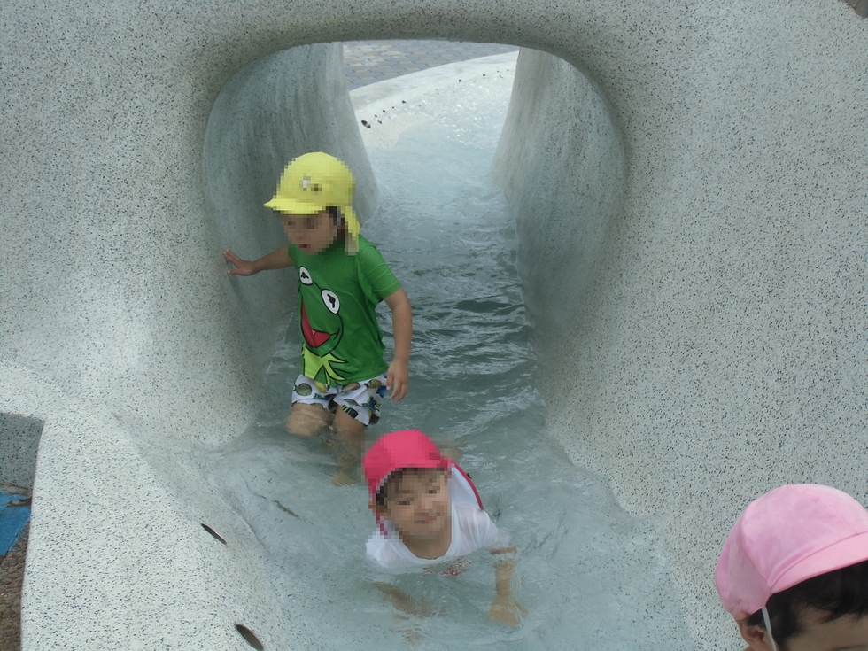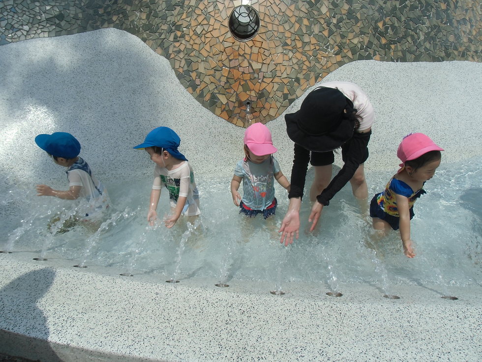写真はランド備え付けの大型水鉄砲の打ち合いで、どこかの幼稚園児に勝った、勝ったと満足げな3・4才児子天使ちゃんトリオ。なぜか右端の子天使ちゃんは敵に向かってポーズ(^-^) ただ、見ていた園長には勝ったのかどうかよく解らなかったのですが(笑)
