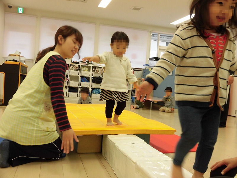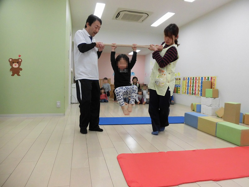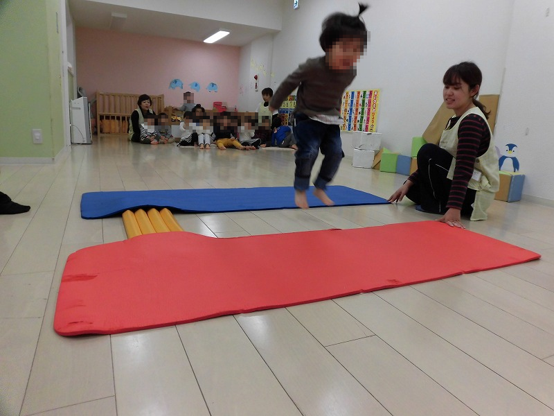 今週は体育プログラムがありました。ところがお外は雨・・。室内で運動能力の測定です(^-^)。