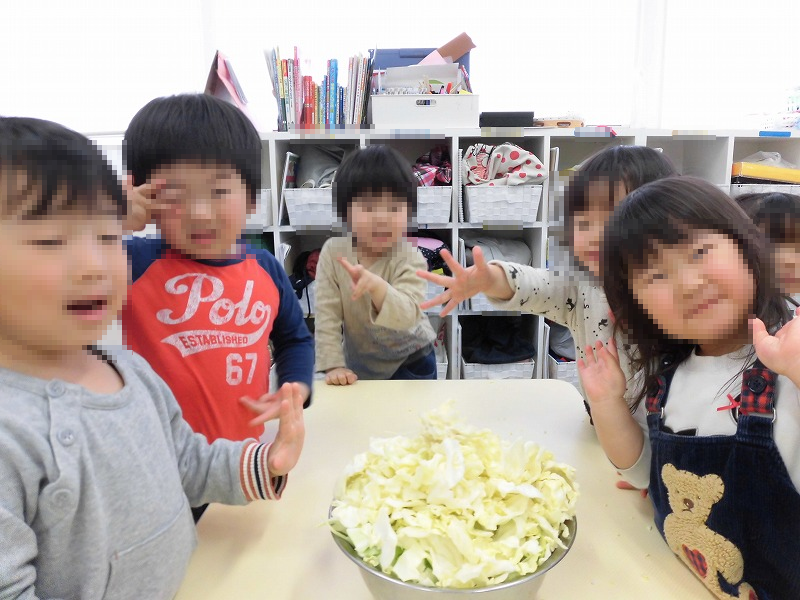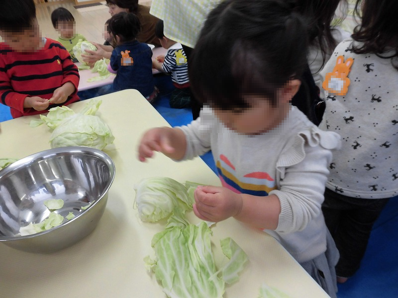 今日の設定保育は食育です。キャベツの皮むきをしました。一枚一枚、丁寧にむいていく子天使ちゃん達(^-^)。上手に出来ました!