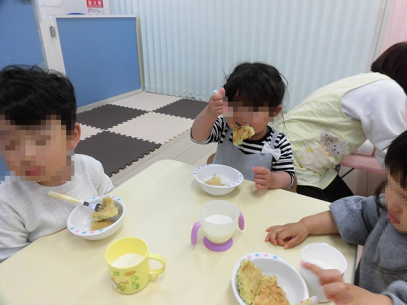 給食士さんにお願いして、この日のおやつはキャベツ焼きにしてもらいました。美味しかったね!(^-^)。