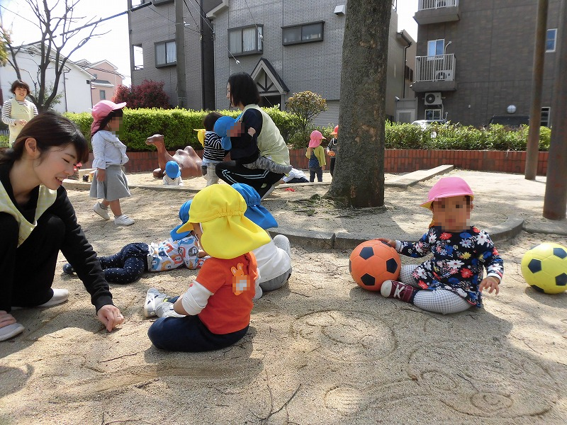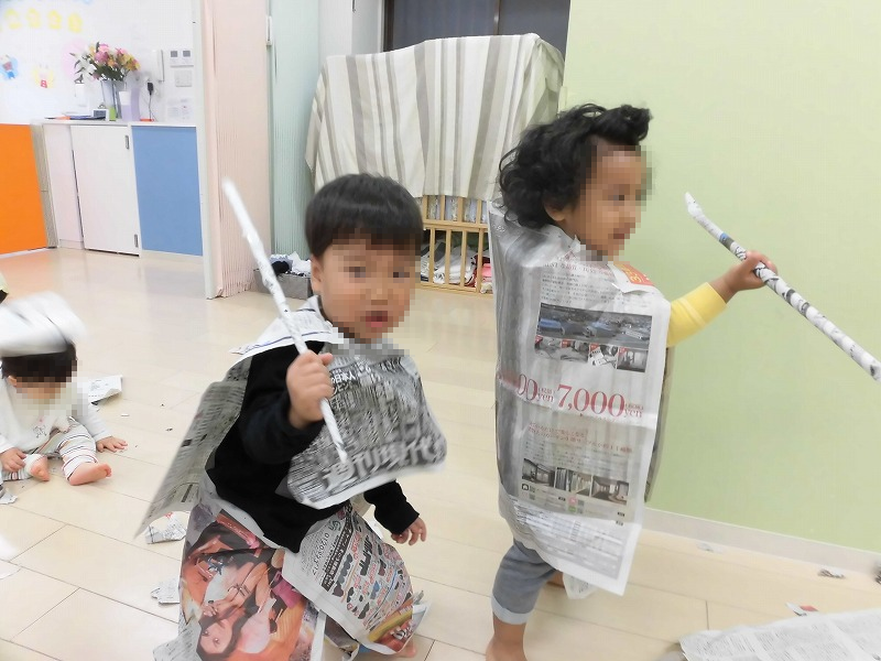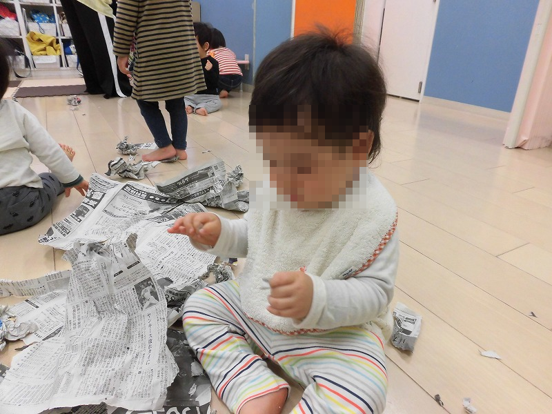 今週の午前中は慣らし保育(^-^)新入子天使ちゃん達の興味をひく遊びがたくさん。下の写真「新聞紙遊び」もそのひとつ。ちぎって、丸めて、ぐちゃぐちゃにしてストレス発散!(笑)赤組さんはカッコ良く「へんし〜ん!」(^-^)。