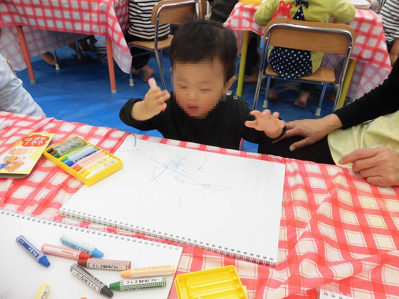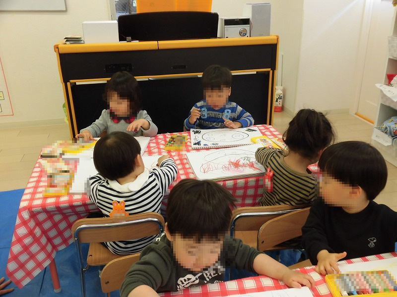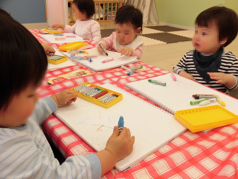 様子を見に行くと自由お絵かきの時間(写真)。下の写真は新入子天使ちゃん達(^-^)。初めて触るクレヨンに興味深々。今年の新子天使ちゃん達、園に慣れるのが早いみたいです(^-^)。
