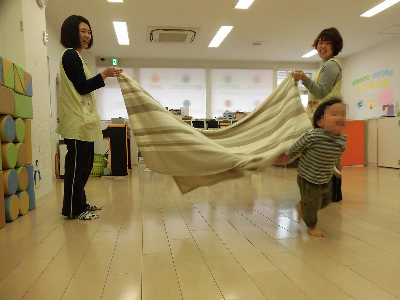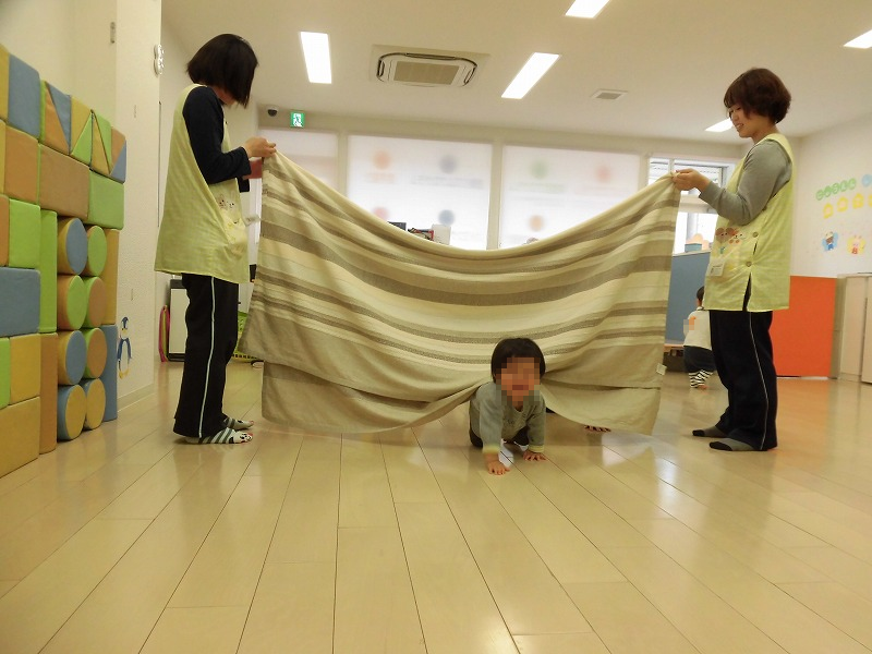 下の写真はカーテンくぐり。子天使ちゃん達(特に月齢の浅い子)にはこれがスゴク面白いみたい(笑)。「キャッキャ♪」っと言いながら挑戦しています(^-^)。