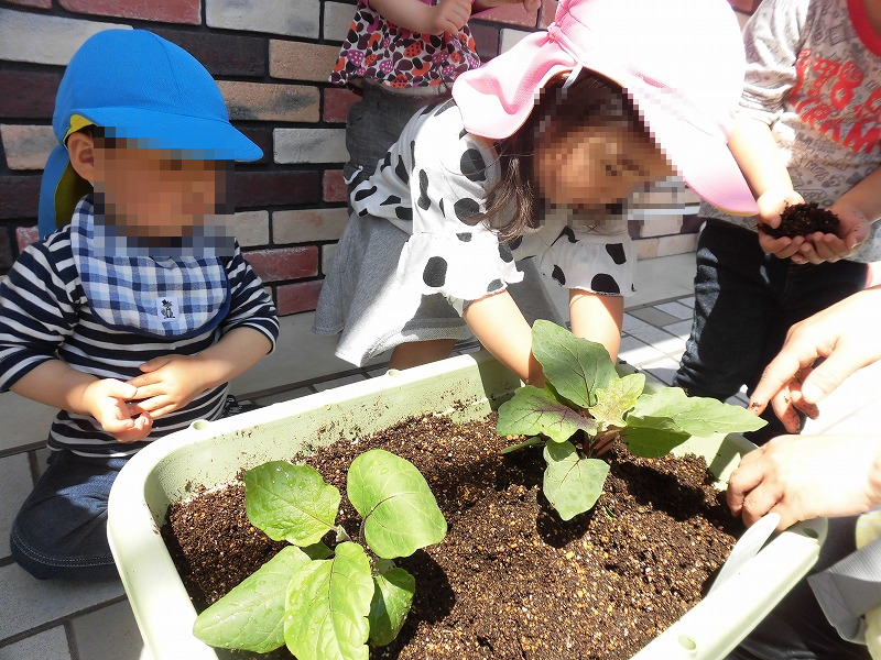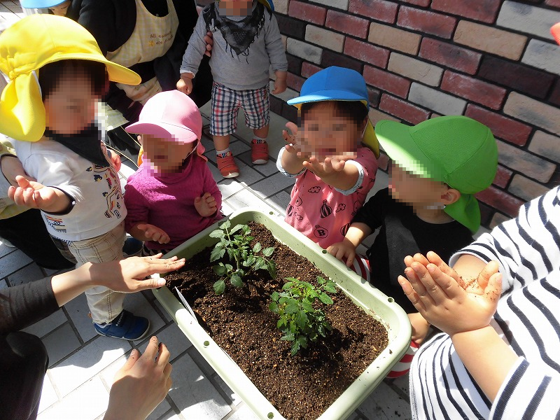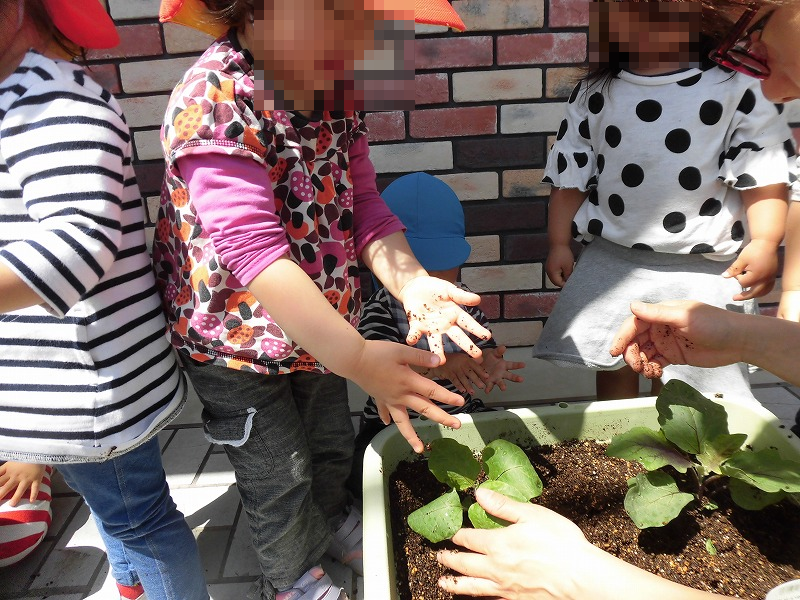 この日はトマトとナスの栽培を始めました。先生からお話を聞いたら〜♪苗を植えて〜土をかけて〜土を優しく固めます(^-^)トントンポンポン♪優しく葉っぱに触って「大きくなぁれ〜♪」子ども達の手は泥だらけ(笑)