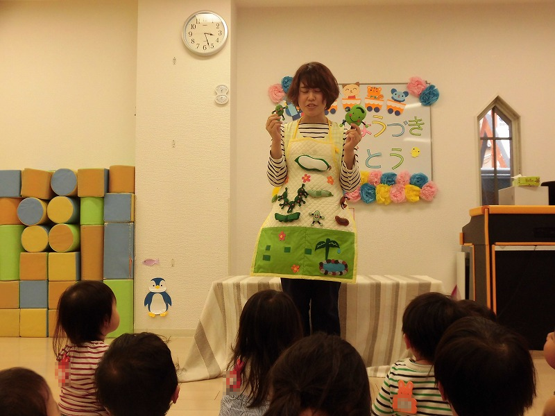 IM先生のエプロンシアター、HM先生のパンダペープサート、IH先生の変身シール工作、HM先生の不思議な水風船(^-^)。