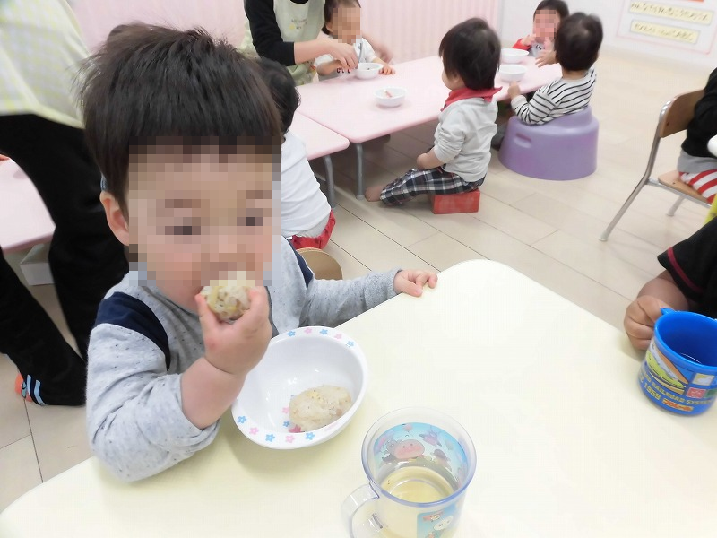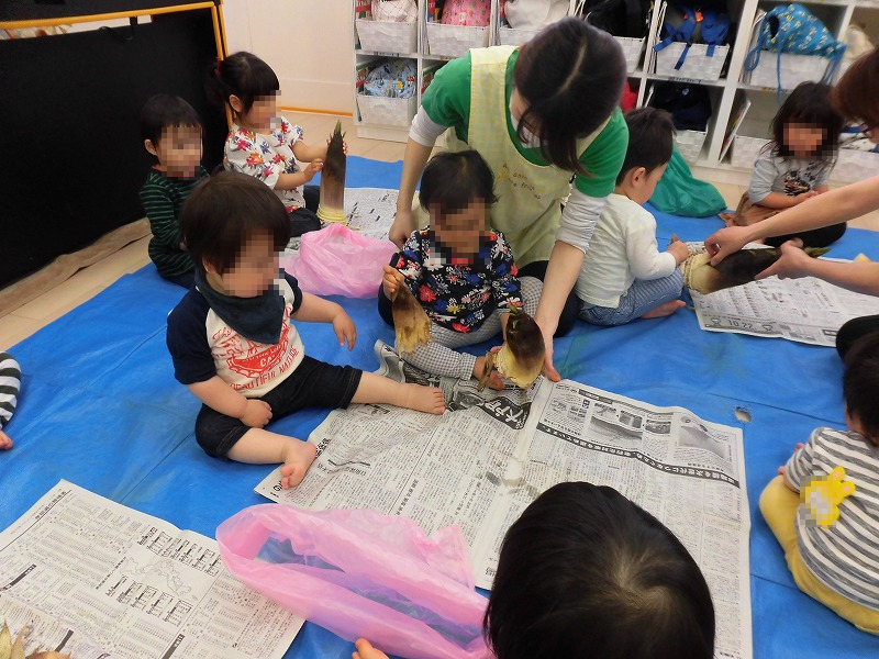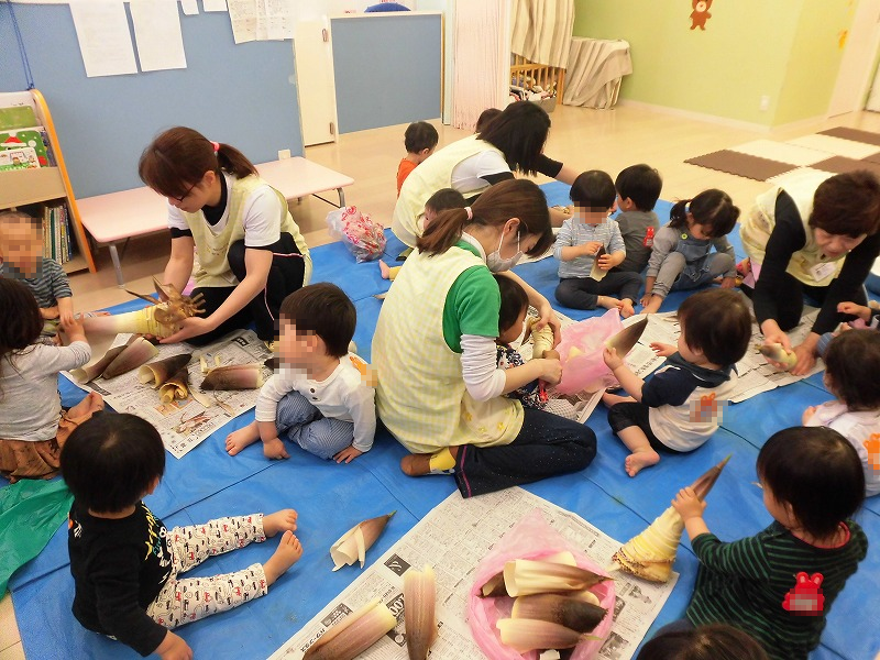 皆でむいたタケノコは一晩あく抜きをして次の日のおやつ「タケノコご飯のおにぎり」になりました(^-^)。すごく美味しかったね〜!