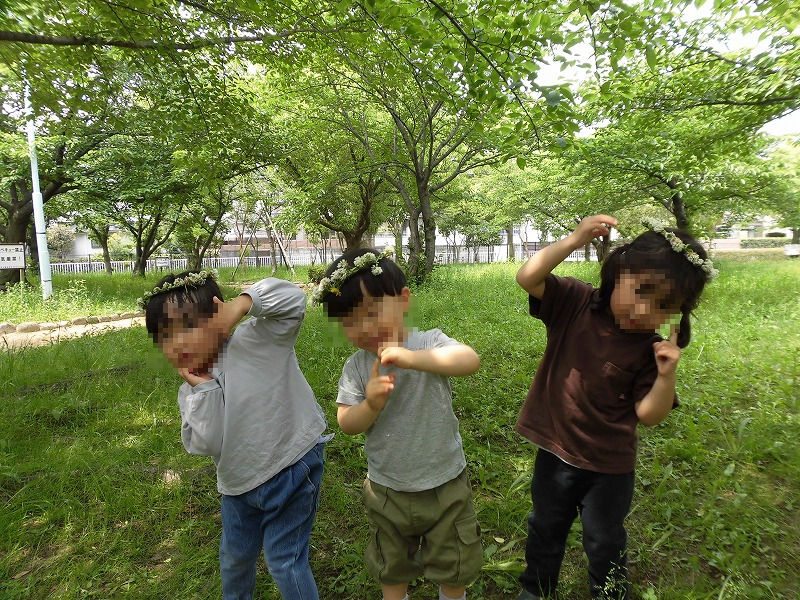 草の上を走り回ったり、寝そべったり(笑)白爪草で作ったかんむりは女子に大人気(^o^)カメラを向けられると自ら「ハイ、ポーズ♪」(笑)