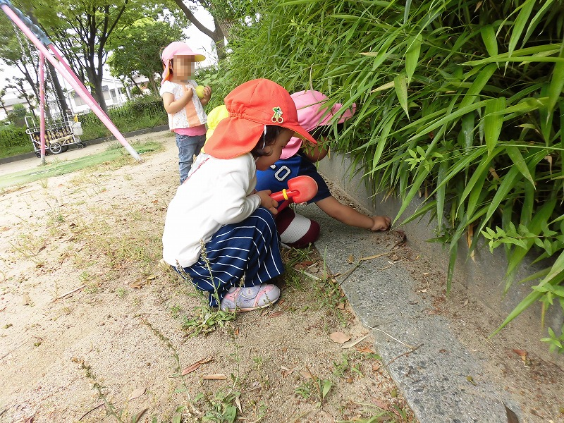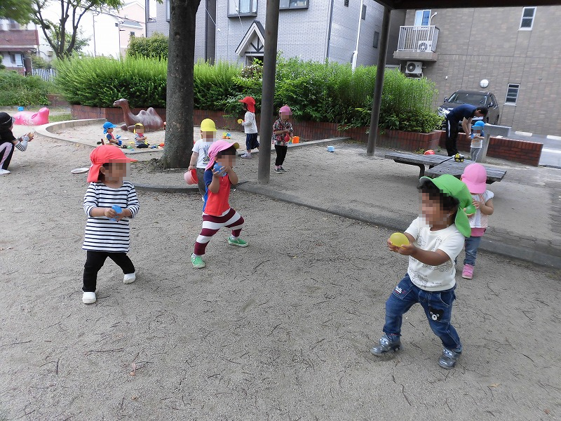 暑い日、今年初めての水風船遊びに興奮する子ども達♪ダンゴ虫を見つけて不思議そうに触れ合う子ども達♪たくさん遊んで心も体も大きく成長していきます(^o^)