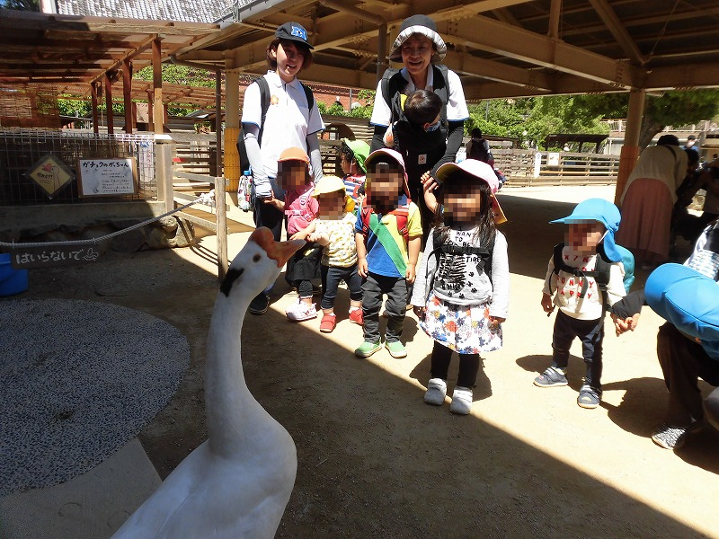 写真は子ども達とあひるさんのお見合い(^-^)。あひるが近づいて来たら「ピキィーン」音をたてて固まった子ども達(笑)。