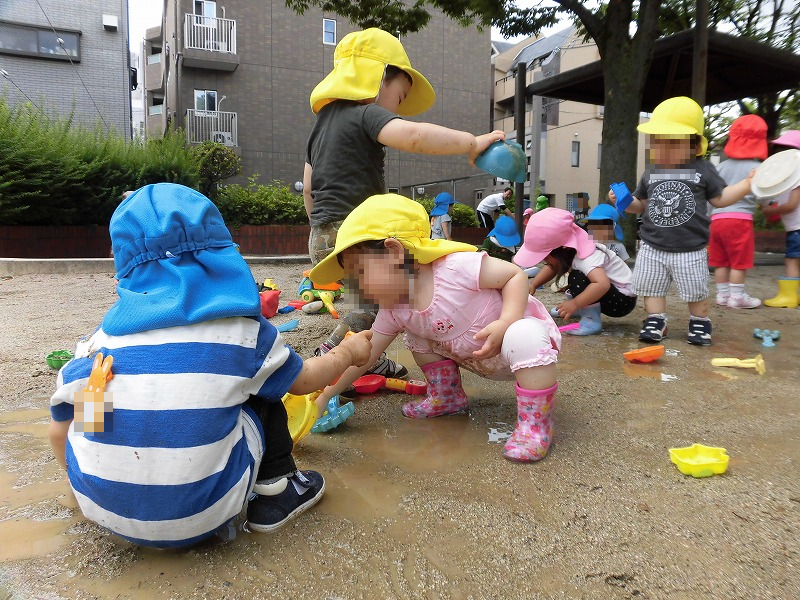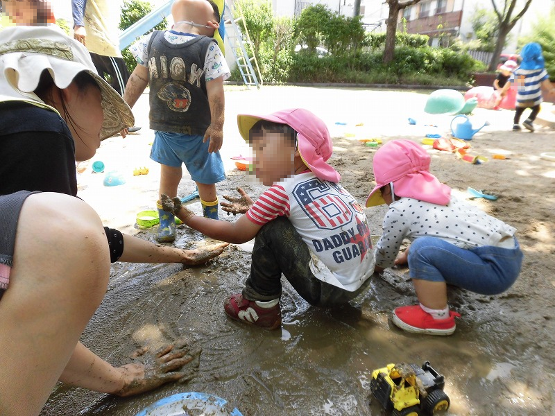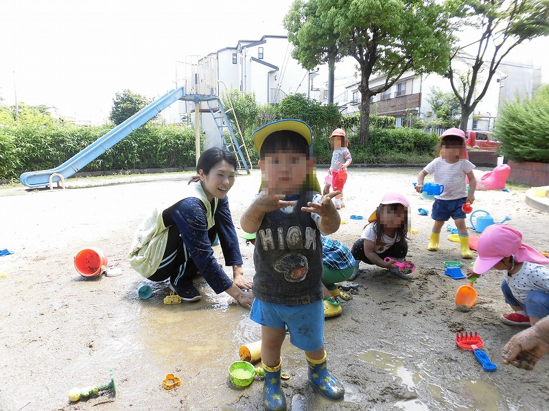 今週は近畿地方も梅雨入り宣言が出されました。梅雨と言えば雨上がりの公園で子ども達の大好きな『泥んこ遊び』の開催です(^-^)。「ペチャペチャ♪」「ビチャビチャ♪」子ども達は大興奮の大喜び!(^o^)。子ども達に泥をぶつけられて先生達も泥だらけ(苦笑)。