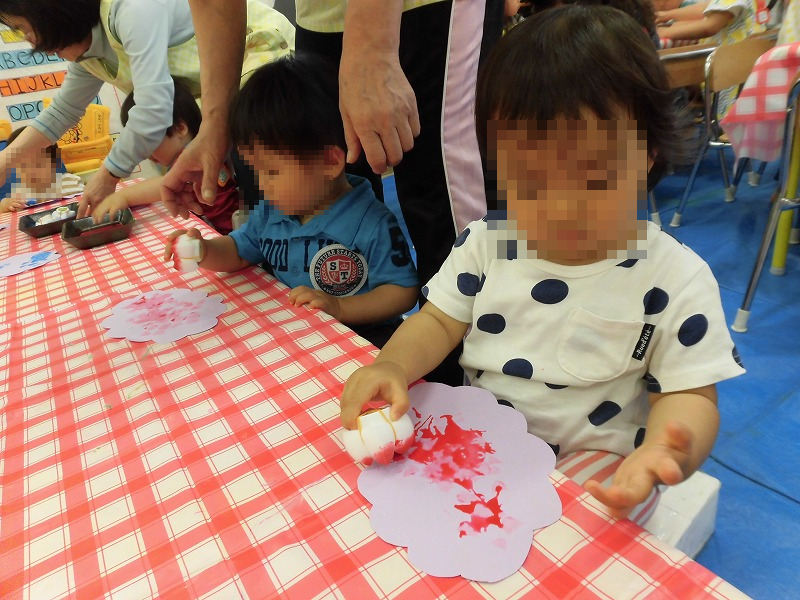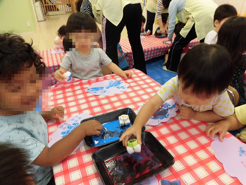 スポンジに色水を含ませて〜「ペッタン・ペッタン♪」「はぁ〜♪ペッタンペッタン♪」子ども達、楽しそう!(^o^)