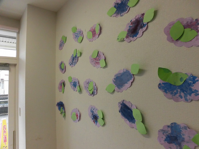 今週の工作は絵具とスポンジスタンプを使って「あじさい」を作りました。