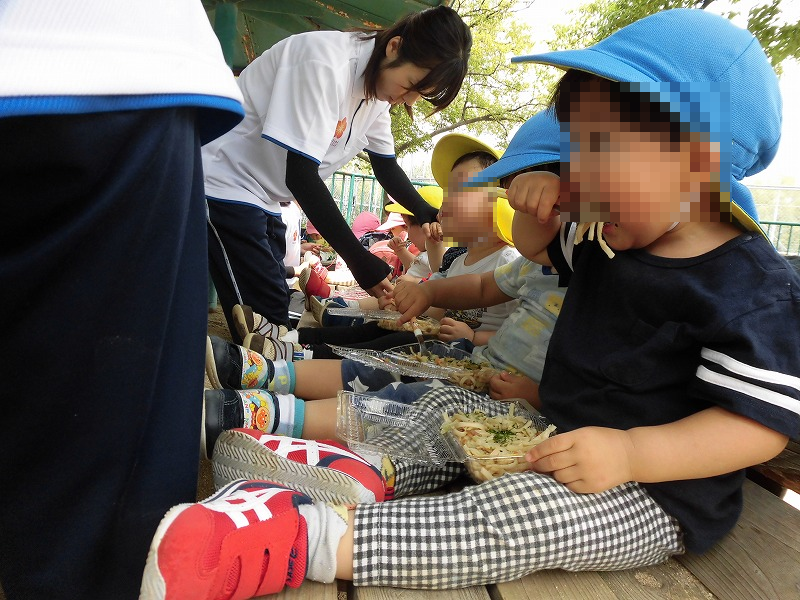遊具や砂場で遊んだあとはお弁当タイム♪この日のお弁当は大盛焼うどん(^-^)。皆すごい食欲です(笑)。パクパクモグモグ美味しいね♪喉に詰まらせないように落ち着いて食べるんだよ(笑)。