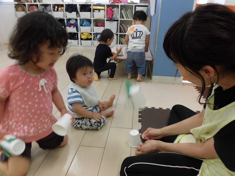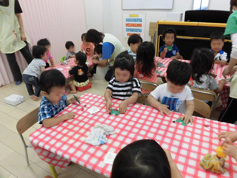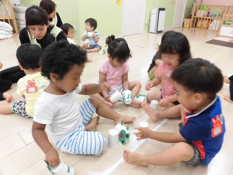午後は自分達で作ったピョンピョンカエルで遊びます♪自分で作ったカエルが上手く飛んだ時の子ども達の笑顔はどことなく誇らしげなんですよ(^-^)。
