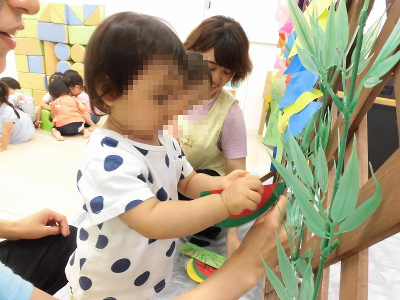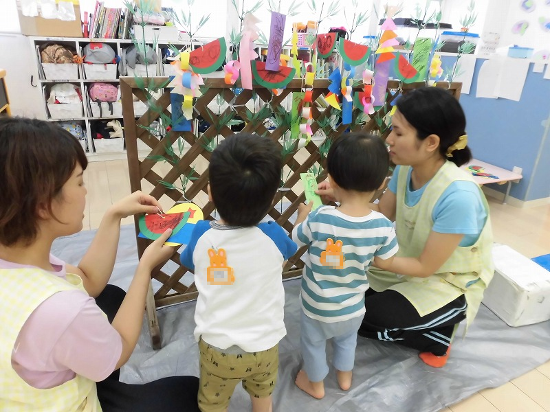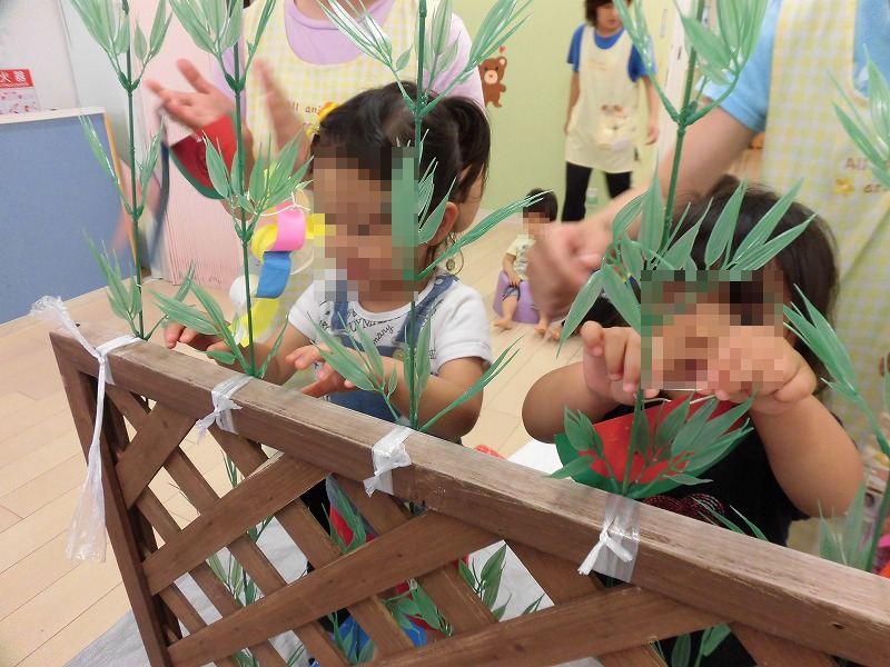 自分達で作った笹飾り、大事に大事にそっと飾り付ける園児たち(笑)。はい、その気持ちよくわかりますよ(^-^)