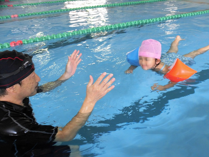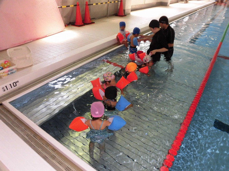 少し慣れたらレッスン開始(^-^)。赤組さんは去年も経験しているので、のみ込みが早いです♪。腕浮き輪をつけて一人で水に浮いたり、自転車こぎをしたり(^-^)。