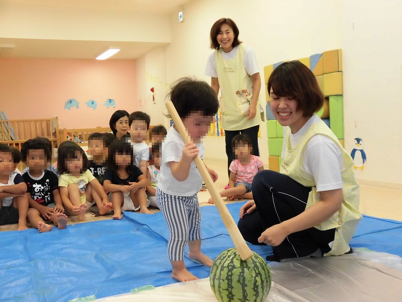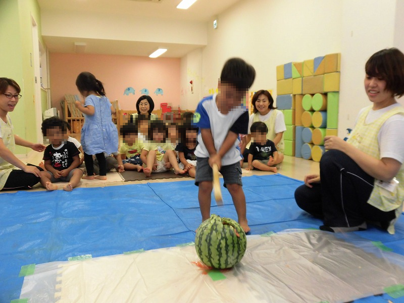 一人一人スイカを叩きます。「えい!」「やあ!」「とう!」「〇※□△!」掛け声は勇ましいのですが、なかなかスイカは割れません(^-^)。